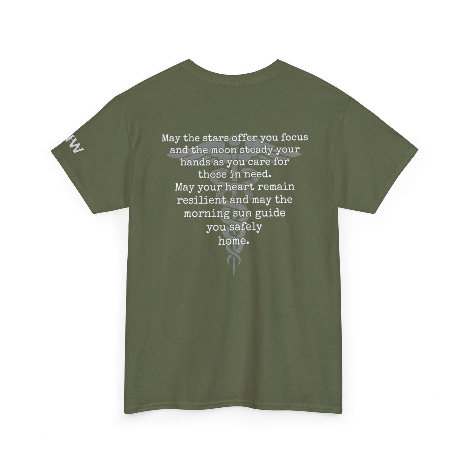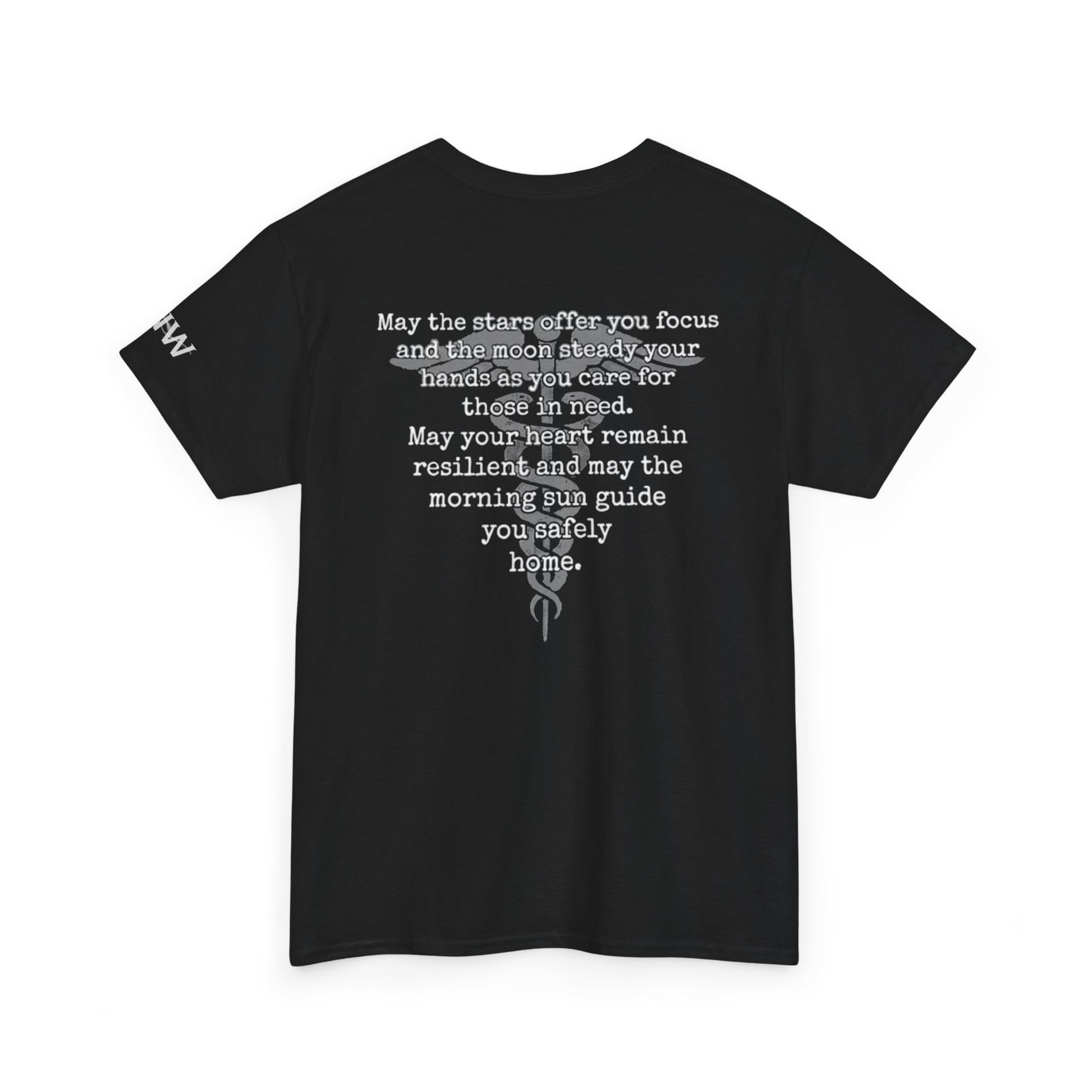 The night shift is a different world. It requires a quiet strength, a steady hand, and a heart that can endure the silence and the chaos alike. We designed this shirt as a wearable blessing for the EMTs, paramedics, CNA's, nurses, doctors and all others who carry the weight of caring for others under the moonlight.