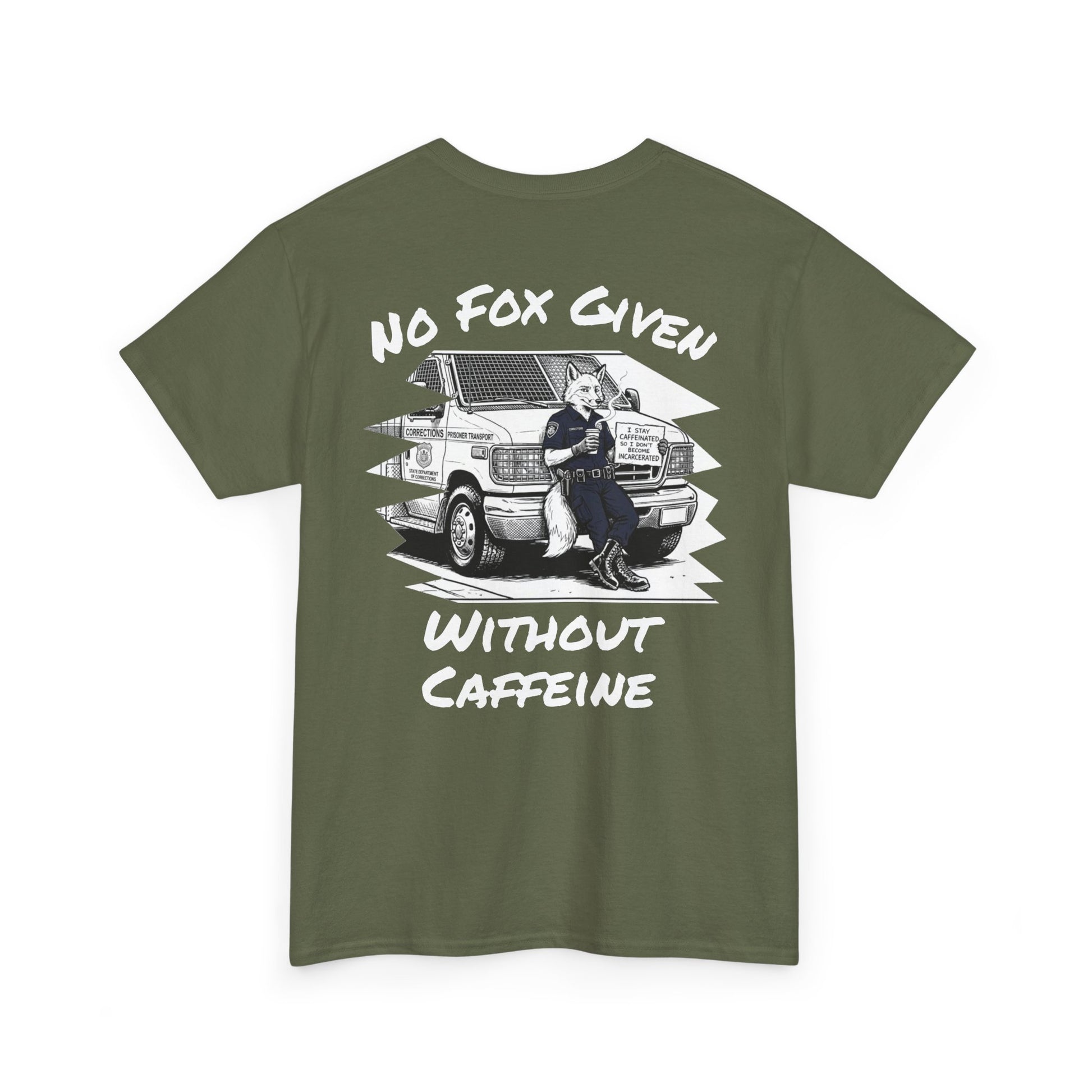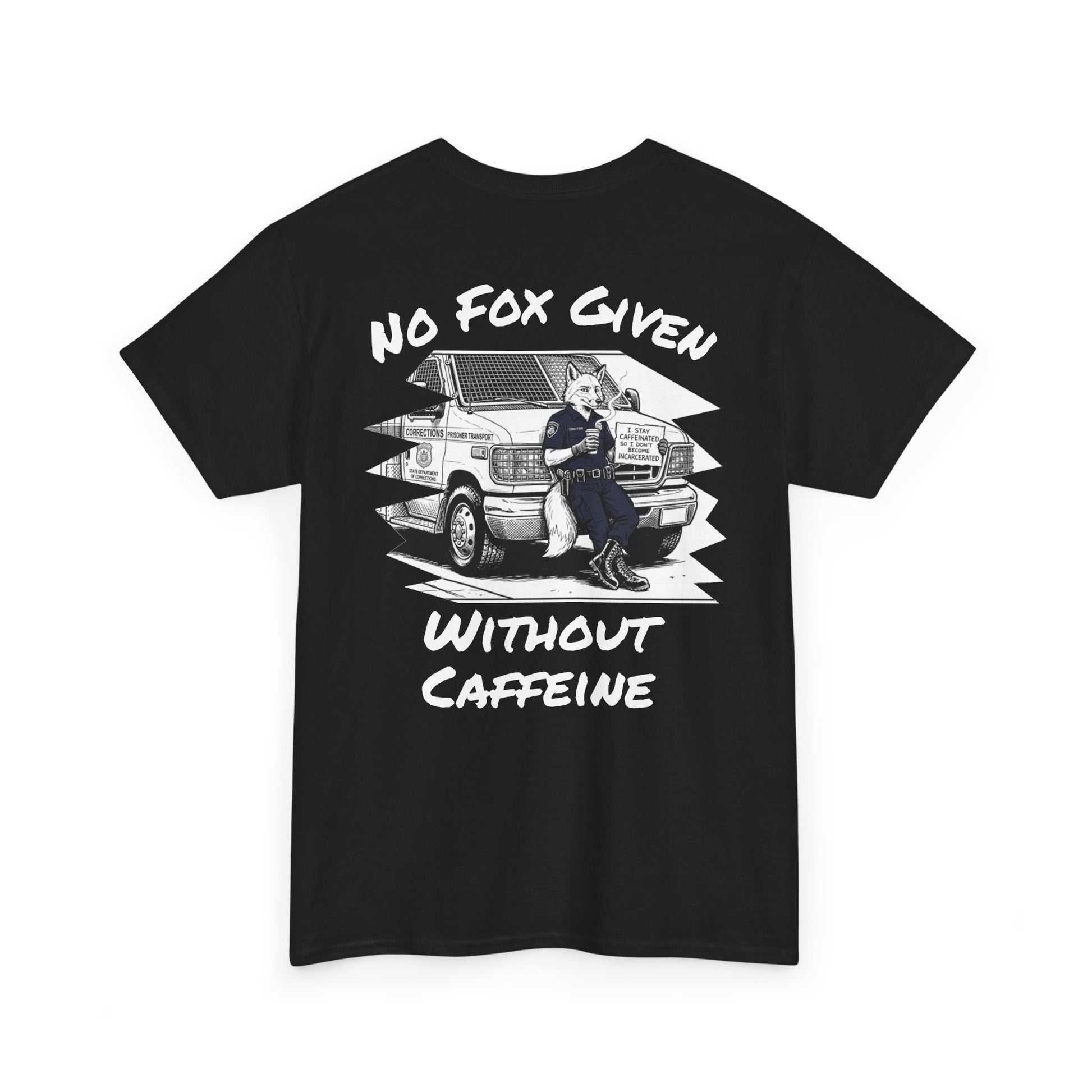 The front features the sleek Gun Powder Grinds Coffee badge logo on the left chest, keeping it professional. The back brings the attitude with a large, detailed graphic of a fox officer leaning against the transport van, delivering the ultimate shift-work ultimatum: "No Fox Given Without Caffeine."